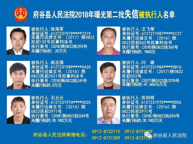為督促被執(zhí)行人自覺履行生效法律文書所確定的義務(wù),切實(shí)保障債權(quán)人的合法權(quán)益,現(xiàn)將府谷縣人民法院執(zhí)行案件的部分失信被執(zhí)行人名單予以曝光。在此,本院鄭重告誡有履行能力的被執(zhí)行人,放棄僥幸心理,主動(dòng)履行義務(wù)。對(duì)于有償還能力拒不償還,對(duì)抗、逃避執(zhí)行,轉(zhuǎn)移、隱匿財(cái)產(chǎn)的被執(zhí)行人,本院將采取嚴(yán)厲的執(zhí)行和制裁措施。