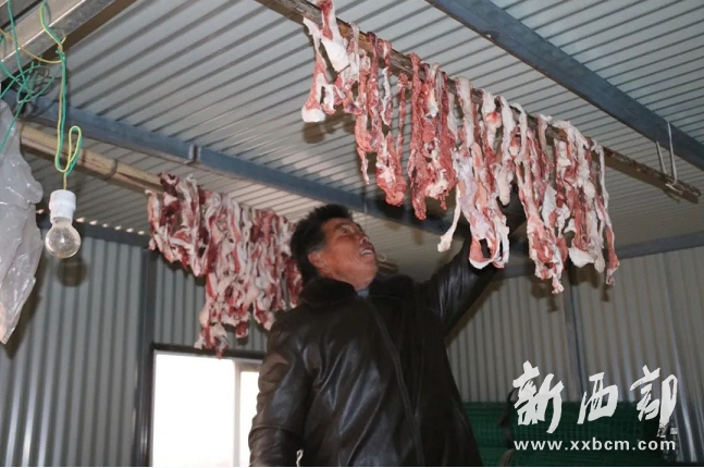 邊增元家的平房邊上有個獨立的庫房,打開門,房梁上掛著整整齊齊的風(fēng)干羊肉?!斑^年就能吃蘭,女子就愛吃風(fēng)干羊肉?!边呍鲈f。他從大缸里拿出一只土雞肉,打開另一只缸,里面放滿了豬肉?!盁捰陀玫?、燉排骨的、炒菜用的......”,不同部位的豬肉都計劃的妥妥當(dāng)當(dāng),羊肉、牛肉也分別存放好。零下的溫度,掛在陰涼處自然風(fēng)干的肉,既去水分又保持鮮味,吃起來肉質(zhì)松脆,口味獨特,烤食或生食都是一道餐桌盛宴。看著滿屋子的肉邊增元不禁感慨,“趕上了好時代,過上了好生活?!?/p>