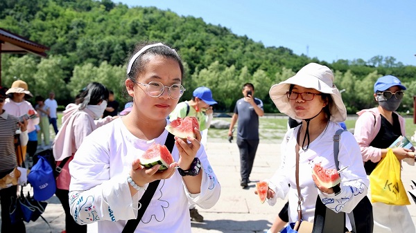 在黃帝陵廟前區(qū)入口處,前來(lái)游玩的游客絡(luò)繹不絕。高溫天,游客游興不減,景區(qū)工作人員更是熱情洋溢,免費(fèi)贈(zèng)送西瓜的“攤位”前圍滿(mǎn)游客,一塊塊清涼的西瓜分配到游客的手中,游客們接過(guò)西瓜,酣暢地咬上了一大口,炎炎夏季,怎一個(gè)“爽”字了得!簡(jiǎn)單的舉動(dòng)、微不足道的一塊西瓜,讓來(lái)自山東的游客趙女士倍感暖心,“感人,天氣熱,但是心很涼爽,真正回家的感覺(jué)。”