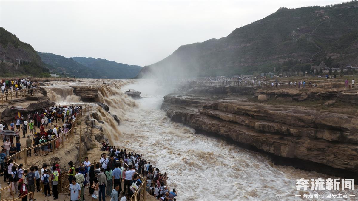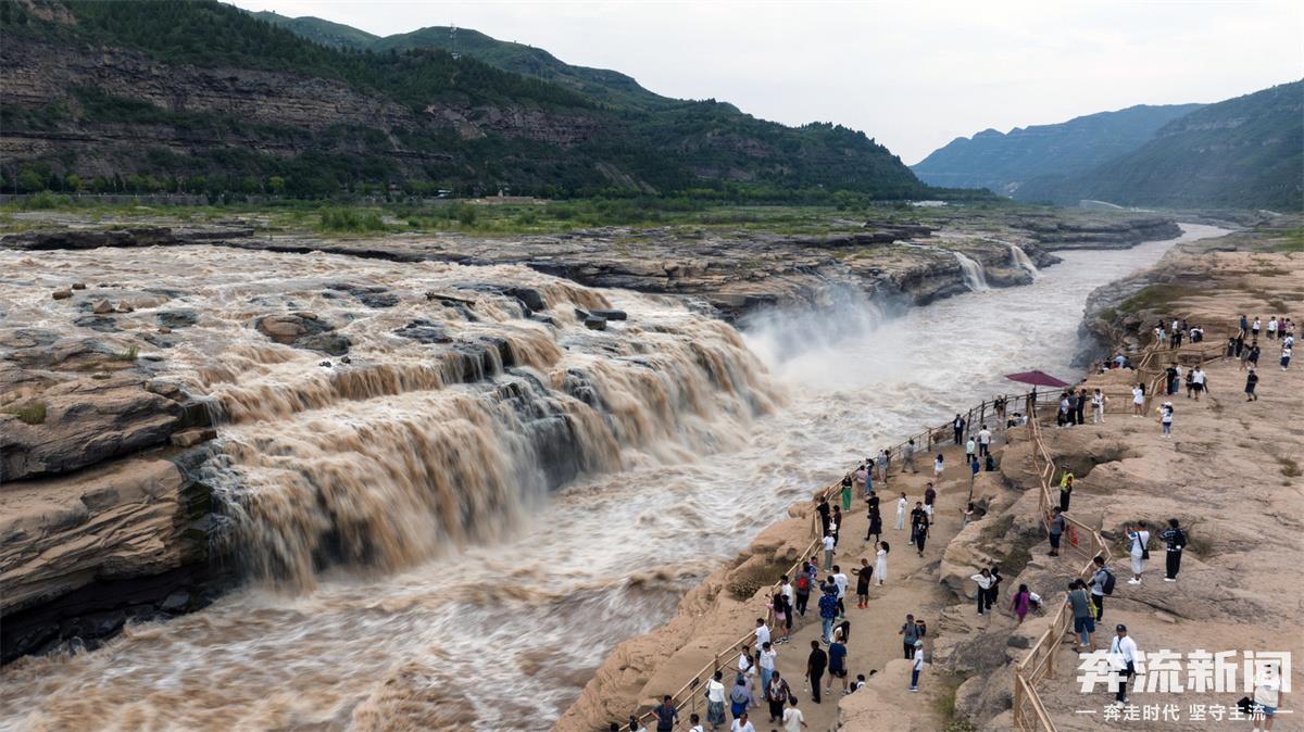 連日來(lái),受黃河中游強(qiáng)降雨影響,黃河壺口瀑布水量增大,滾滾河水奔流而下,形成壯美瀑布群景觀,吸引了眾多游客。