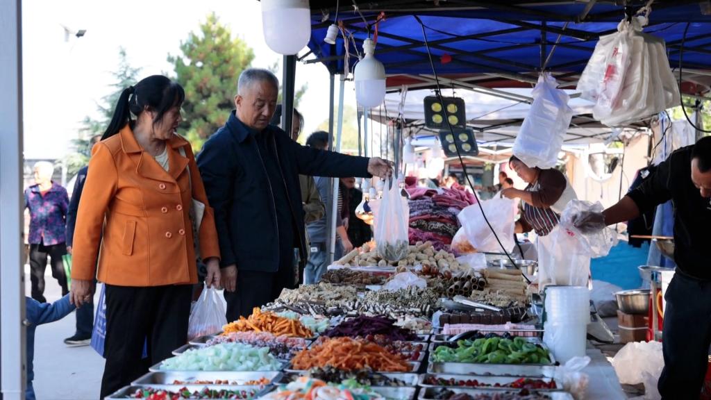集市上,來自各地的商販以及周邊十里八村的鄉(xiāng)親們紛紛前來“趕集”。各色攤位有序排列在街道兩旁,攤販們忙碌地?cái)[放著各自的商品。從米面糧油到新鮮蔬果,從各色農(nóng)具到手工制品,從玩具零食到鞋襪衣帽,每一件物品都散發(fā)著濃厚的地方特色,共同勾勒出一幅誘人的鄉(xiāng)村風(fēng)情畫。