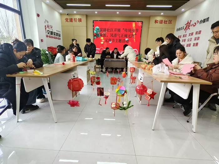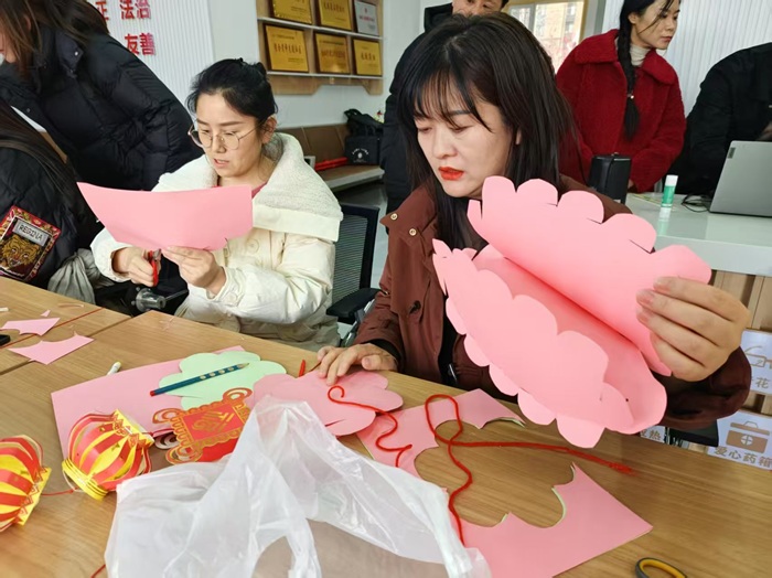 活動現(xiàn)場布置得溫馨而喜慶,彩色的拉花、喜慶的福字將社區(qū)活動中心裝點得年味十足。桌上擺放著制作燈籠的各種材料,有紅色的彩紙、細(xì)竹條、剪刀、膠水等,一應(yīng)俱全,仿佛在等待著居民們開啟一場創(chuàng)意之旅。