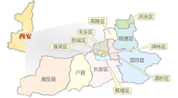 截至2014年年底,西安市轄新城、碑林、蓮湖、雁塔、灞橋、未央、閻良、臨潼、長安、高陵10個(gè)區(qū),藍(lán)田、周至、戶縣3個(gè)縣。