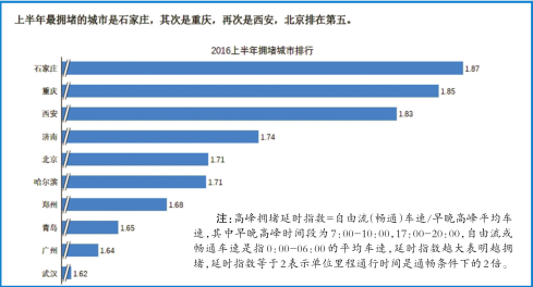 2016年上半年,全國400個城市平均擁堵延時指數(shù)為1.58,平均時速為24.8km/h。其中,一月份最堵,最堵的一天為1月29日,當日全國平均車速為21.1km/h;二月份最暢通,最暢通的一天是2月9日,當日全國平均車速達29.4km/h。