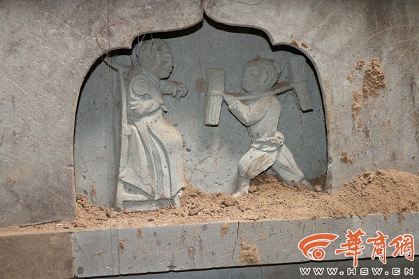 其中,北面墻中間有一處龕室,龕室有高浮雕圖像,圖像清晰可見(jiàn)。東面墻有龕室兩處,一處有磚刻高浮雕圖像,人物圖像勾勒細(xì)膩逼真,由于遭到破壞,無(wú)法看清人物著裝,另外一處無(wú)浮雕,可能遭到破壞。西面墻同東面墻布局一樣,有龕室兩處,均有高浮雕圖像。南邊的圖像已造到破壞,無(wú)法辨別,北邊的浮雕圖像完整,清晰可見(jiàn)。這些圖像都是“二十四孝”故事。
