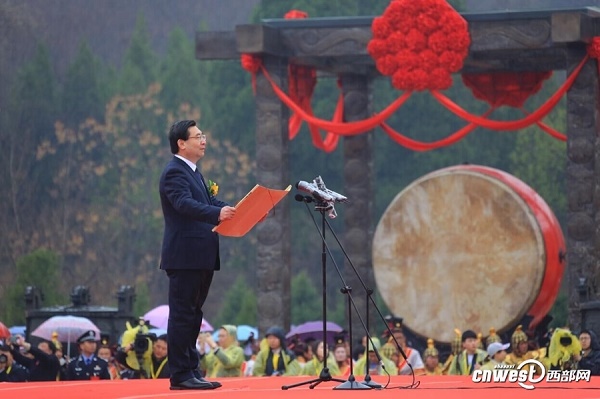陜西省代省長胡和平恭讀祭文,“惟公元二零一六年四月四日,歲次丙申,節(jié)屆清明,炎黃子孫,聚首橋山之陽,謹(jǐn)以鮮花雅樂之奠,恭祭于我人文初祖軒轅黃帝之陵,其辭曰: