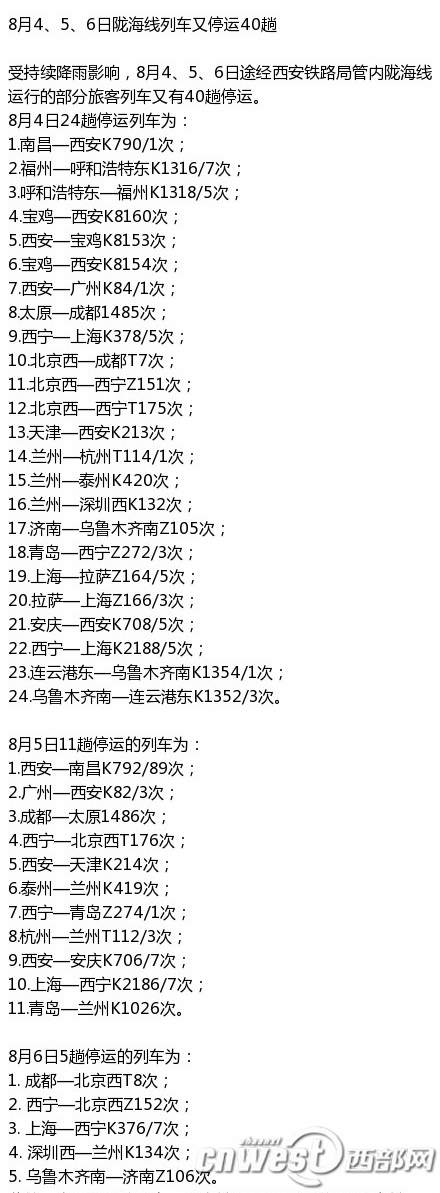 受持續(xù)降雨影響,8月4、5、6日途徑西鐵局管內(nèi)隴海線運行的部分旅客列車又有40趟停運。