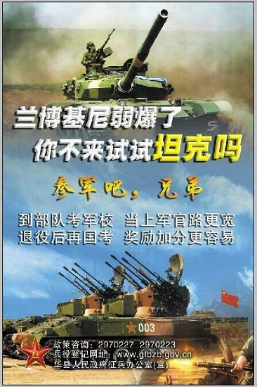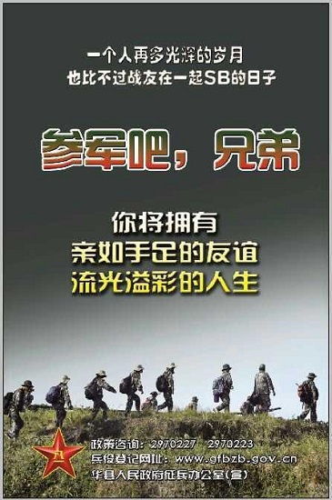 “蘭博基尼弱爆了,你不來試試坦克嗎?參軍吧,兄弟!到部隊考軍校,當(dāng)上軍官路更寬,退役后再國考,獎勵加分更容易?!边@是陜西省軍區(qū)渭南軍分區(qū)華縣人民武裝部今年征兵宣傳畫其中的一幅,而配圖是威武的坦克在硝煙彌漫的戰(zhàn)場快速前行。華商報記者發(fā)現(xiàn),華縣人民武裝部今年的征兵宣傳畫共9幅,內(nèi)容包括戰(zhàn)士負(fù)重匍匐前行、高原上武裝越野、駕駛戰(zhàn)機(jī)翱翔藍(lán)天等,背景配圖不但有滿臉汗水的戰(zhàn)士表情特寫,還有部隊在高山、雪原間武裝行進(jìn)的大場面。