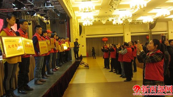 主席臺領(lǐng)導(dǎo)為獲獎?wù)哳C發(fā)獎牌、獎杯和證書 新西部網(wǎng) 王順利攝