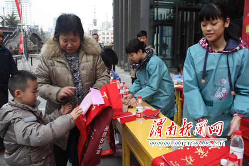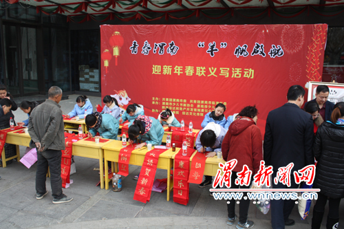 昨日上午,由渭南新聞網(wǎng)、共青團(tuán)渭南市委、共青團(tuán)渭南市臨渭區(qū)委、渭南公益網(wǎng)聯(lián)合舉辦的“青春渭南 “羊”帆起航 迎新春春聯(lián)義寫活動(dòng)”在渭南市信達(dá)廣場(chǎng)舉行。來(lái)自陜西書畫藝術(shù)社的書法大家和書畫院的孩子們一起,老少協(xié)作,為市民義寫春聯(lián),將新春祝福送給廣大市民。(記者 徐磊 實(shí)習(xí)記者 馬玥 攝影報(bào)道)