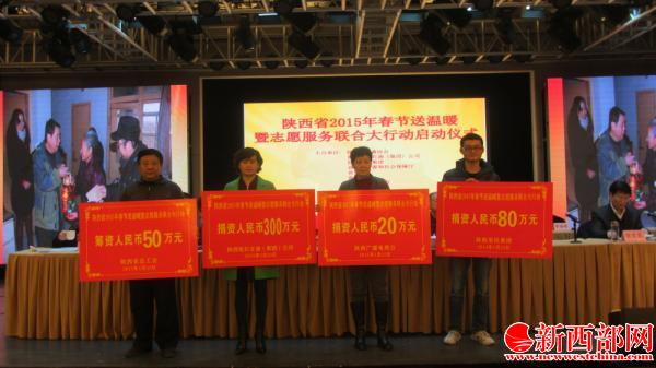 新西部網(wǎng)西安1月23日西安消息(王順利)由陜西省慈善協(xié)會發(fā)起,陜西延長石油(集團(tuán))公司、陜西榮民集團(tuán)、省人力資源和社會保障廳、省民政廳、省總工會、陜西省廣播電視臺及各設(shè)市(區(qū))慈善協(xié)(總)會共同舉辦的“情暖萬家愛心傳遞”陜西省2015年春節(jié)送溫暖暨志愿服務(wù)聯(lián)合大行動啟動儀式在省政府隆重舉行。多方籌集到的440萬元善款將全部用于慰問2萬戶特困家庭。