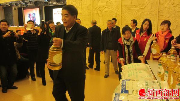 陜西省慈善協(xié)會會長劉維隆在啟動儀式上送出第一份慰問品。新西部網(wǎng) 王順利攝