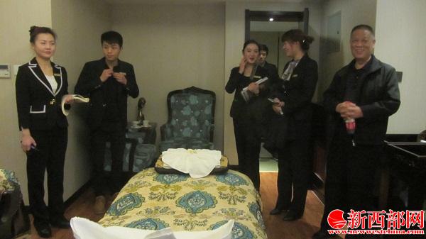 由工作人員陪同,陜西省養(yǎng)生協(xié)會(huì)會(huì)長(zhǎng)卜廣民(右一)在四季華庭酒店SPA會(huì)所包間參觀指導(dǎo)。SPA一詞源于拉丁文“Salus Per Aquam”(Health by water)的字首,Salus(健康),Per(在), Aquam(水中),意指用水來(lái)達(dá)到健康,健康之水。spa是指利用水資源結(jié)合沐浴、按摩、涂抹保養(yǎng)品和香熏來(lái)促進(jìn)新陳代謝,滿足人體視覺(jué)、味覺(jué)、觸覺(jué)、嗅覺(jué)和思考達(dá)到一種身心暢快的享受。spa是由專業(yè)美療師、水、光線、芳香精油、音樂(lè)等多個(gè)元素組合而成的舒緩減壓方式,能幫助人達(dá)到身、心、靈的健美。新西部網(wǎng) 王順利攝