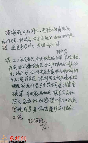 韓城市委常委、常務(wù)副市長張海乾同志對拖欠農(nóng)民工事件作出重要批示
