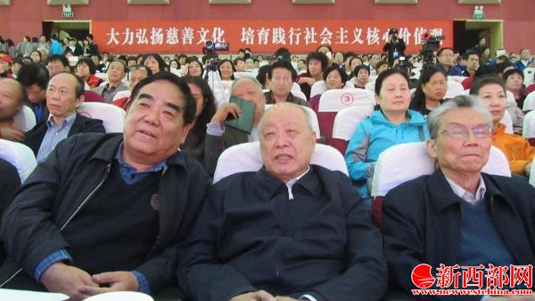 陜西省慈善協(xié)會會長劉維隆(前左)贊揚大賽主持人孫維對慈善公益事業(yè)辛勤工作。新西部網(wǎng) 王順利攝