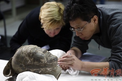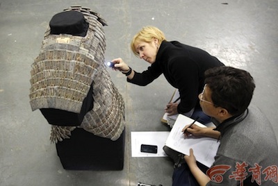 省文物交流中心項(xiàng)目主管張正與美國印第安納波利斯兒童博物館藏品部展覽保藏經(jīng)理克里斯提·奧格雷迪正在點(diǎn)交秦陵出土的國家一級文物——一件石鎧甲。點(diǎn)交前,他們把有617塊的鎧甲分成九個(gè)區(qū)域:左肩、右肩、前胸、后背、上部、左肋、右肋、前襟、后襟。點(diǎn)交時(shí),一個(gè)部位一個(gè)部位進(jìn)行,比如左肩先從第一行一片一片的鎧甲片來點(diǎn),每片都要查看上面有沒有污漬、有無殘缺等,并記錄在案。