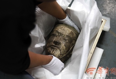4月12日上午,記者隨陜西省文物交流中心的專家,和負(fù)責(zé)此次文物包裝運(yùn)輸?shù)年兾魅A協(xié)國際珍品貨運(yùn)服務(wù)有限公司的工作人員進(jìn)入我省一文物庫房。