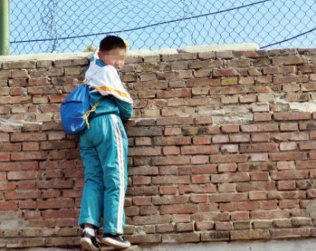 近日11時許,記者正在聚才巷附近采訪,剛掏出相機,就拍到兩個背著書包的小學生從旁邊榆林學院操場翻墻過來,該外墻目測有4米多高,著實讓人為這兩位“膽大”的小學生捏一把汗。
