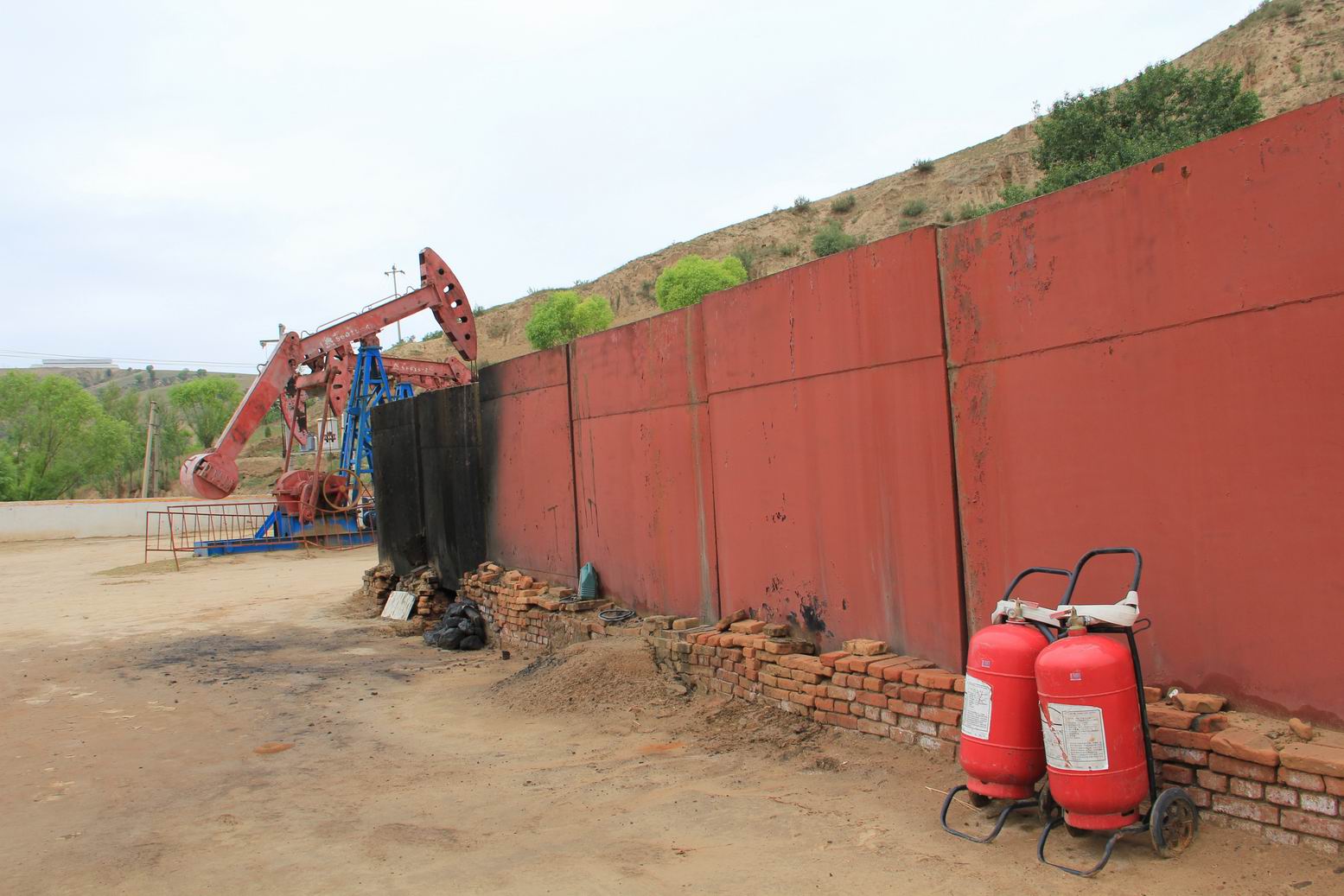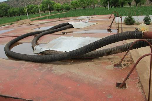 采訪團經(jīng)指引參觀延長石油靖邊采油廠一處示范井場,可以看到現(xiàn)場放置方形儲油罐,油罐頂部配有黑色油管。而記者沿公路觀察發(fā)現(xiàn),幾處油井場緊靠油罐用磚壘有排煙筒,油罐一側(cè)底部和罐體留有燃煤煙痕跡。據(jù)工作人員介紹,該廠油井多用燃煤明火將原油就地加溫脫水,脫水后的原油用汽車運輸,后來有的井場改用電熱加溫原油。在靖邊縣河流沿岸,有的油井場地正在加工原油,煙筒冒出濃煙。