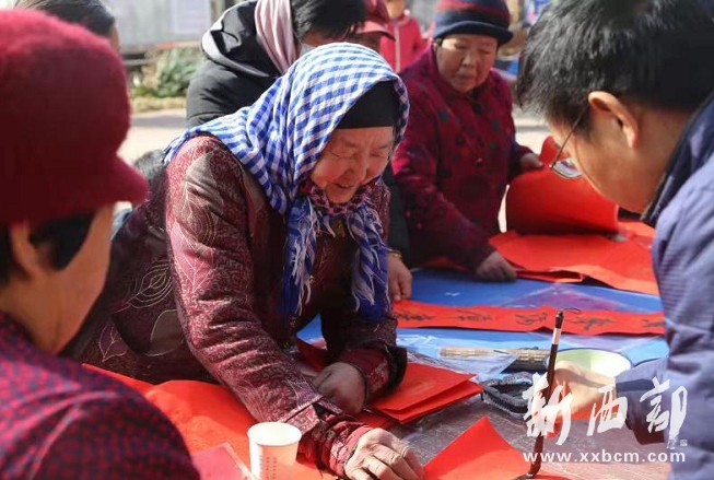 在陳倉(cāng)區(qū)書法家協(xié)會(huì)主席符浩、副主席兼秘書長(zhǎng)劉永軍等四位書法家為村民義務(wù)書寫春聯(lián)的活動(dòng)現(xiàn)場(chǎng),聞?dòng)嵍鴣?lái)的村民們一早就圍攏在各位書法家揮毫潑墨的桌前。有的村民想要書寫的福字,有的想要春聯(lián),大家爭(zhēng)先恐后,紛紛幫忙倒墨、壓紙、晾曬,眼中充滿了期待和喜悅,生怕錯(cuò)過(guò)一幅字。手捧新寫的春聯(lián),村民們個(gè)個(gè)臉上洋溢著笑容,一幅幅吉祥喜慶、翰墨飄香的福字和春聯(lián)描繪出了村民們對(duì)美好生活的憧憬和期盼。義務(wù)書寫春聯(lián)送祝?;顒?dòng)一直持續(xù)到中午12點(diǎn)多,共給當(dāng)?shù)卮迕袼统龃郝?lián)福字400余幅。(通訊員:韋曉寧)