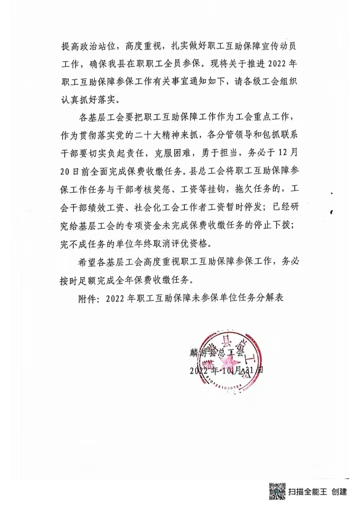 二是領(lǐng)導(dǎo)重視、措施得力。縣總工會重視職工互助保障參保續(xù)保工作任務(wù)的落實,研究印發(fā)了《麟游縣關(guān)于持續(xù)推進2022年度職工互助保險參保工作的通知》,要求各基層工會要把職工互助保障工作作為工會重點工作,作為貫徹落實黨的二十大精神來抓,并將工作任務(wù)分解到全縣工會系統(tǒng)全體干部職工,使每一位工會干部肩上都有擔(dān)子。
