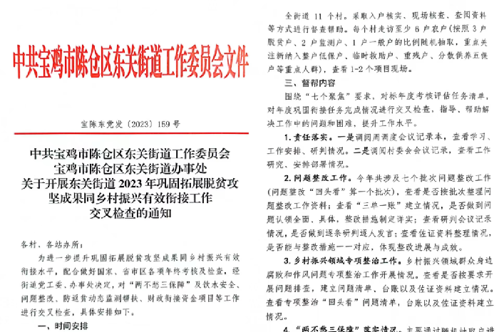 為進(jìn)一步推進(jìn)鞏固拓展脫貧攻堅(jiān)成果同鄉(xiāng)村振興有效銜接工作扎實(shí)開(kāi)展,高質(zhì)量完成年終考核評(píng)估工作,確保我街道鄉(xiāng)村振興各項(xiàng)工作落到實(shí)處。12月5日至12月8日,陳倉(cāng)區(qū)東關(guān)街道組織開(kāi)展鞏固拓展脫貧攻堅(jiān)成果同鄉(xiāng)村振興有效銜接交叉檢查工作。