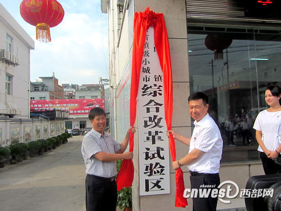 安康市委書記郭青、陜西省編委辦副主任史豐有為恒口鎮(zhèn)級小城市綜合改革試驗區(qū)揭牌。