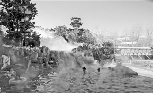 | 秦嶺腳下的湯峪鎮(zhèn),自古就有“桃花三月湯泉水,春風(fēng)醉人不知歸”的美譽。圖為游人正在享受冬季溫泉的樂趣。 雷寬暢攝