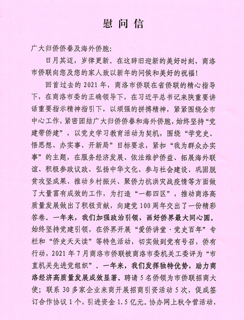為充分發(fā)揮橋梁紐帶作用,廣泛團(tuán)結(jié)和凝聚廣大僑胞,進(jìn)一步涵養(yǎng)僑界資源,商洛市僑聯(lián)精心撰寫了《致廣大歸僑僑眷及海外僑胞的慰問(wèn)信》,發(fā)送給歸僑僑眷和因疫情影響暫時(shí)無(wú)法返鄉(xiāng)的海外僑胞,向他們傳遞節(jié)日祝福,感謝他們對(duì)市僑聯(lián)事業(yè)和家鄉(xiāng)建設(shè)的支持。山遙路遠(yuǎn),紙短情長(zhǎng),濃濃的問(wèn)候,貼心的話語(yǔ),讓他們感受到市僑聯(lián)“娘家人”的牽掛。收到問(wèn)候的僑胞紛紛表示,將繼續(xù)發(fā)揚(yáng)“愛國(guó)、愛鄉(xiāng)、愛自己家人”的精神,在新時(shí)代共同書寫振興中華、振興家鄉(xiāng)的嶄新篇章。