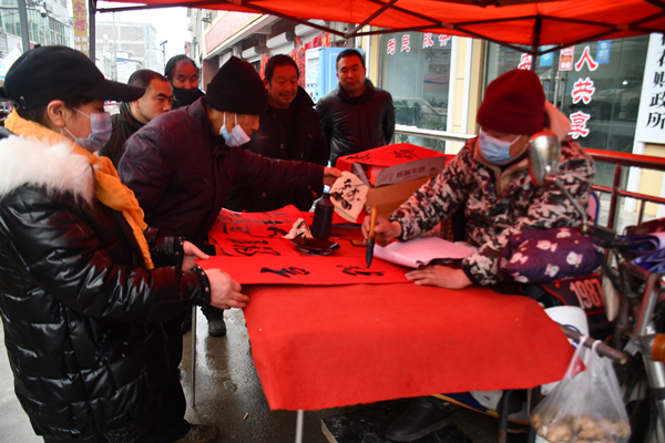 1月28日上午,漫天雪花驅(qū)散了人們心中疫情的陰霾,丹鳳縣棣花古鎮(zhèn)街道又恢復(fù)了年關(guān)趕集的繁忙,在鎮(zhèn)政府門前的小廣場上,重度肢體殘疾人賈滿濤半坐半靠在用三輪車改裝的臨時書案前,一邊神情專注的揮毫潑墨為鄉(xiāng)親義寫春聯(lián),一邊笑呵呵的對大家說:“不要擁擠,人人有份,今年心情好,我給大家寫個夠?!?/p>