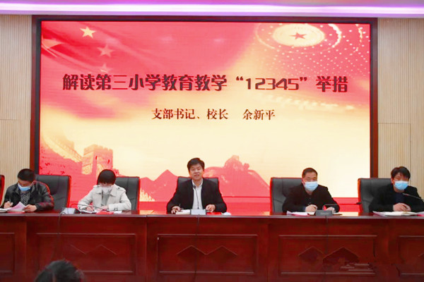 學(xué)校黨支部書記、校長(zhǎng)余新平解讀了該?!?2345”管理工作思路。即:抓好“一個(gè)中心”:強(qiáng)化教育教學(xué)工作的中心地位,全面提高教育教學(xué)質(zhì)量。緊扣“兩個(gè)重點(diǎn)”:創(chuàng)新落實(shí)雙減和課后服務(wù)。力爭(zhēng)“三個(gè)為零”:德育工作零投訴,安全工作零事故,經(jīng)濟(jì)債務(wù)“零增長(zhǎng)”。執(zhí)行“四字方針”:工作中突出一個(gè)“實(shí)”字、落實(shí)一個(gè)“勤”字、體現(xiàn)一個(gè)“細(xì)”字、貫徹一個(gè)“嚴(yán)”字。落實(shí)“五大工程”:一是黨建引領(lǐng)工程;二是質(zhì)量品牌工程;三是爭(zhēng)先創(chuàng)優(yōu)工程;四是特色活動(dòng)工程;五是餐廳樓建設(shè)工程。