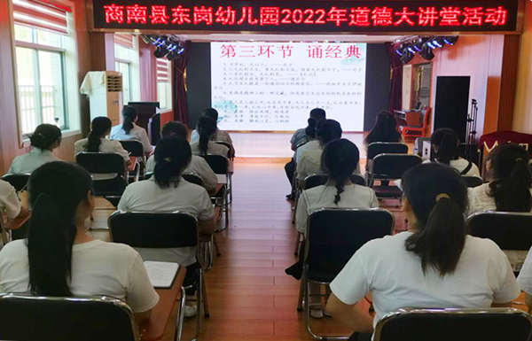 為全面提升全園教師文明禮儀素養(yǎng),進一步推進師德師風(fēng)建設(shè),塑造良好的教師職業(yè)形象,6月14日,商南縣東崗幼兒園開展了“以‘禮’潤師德,用‘儀’養(yǎng)師表”為主題的道德大講堂活動。此次活動由唱歌曲、做自問、誦經(jīng)典、聽講座、談感悟、展風(fēng)采六個環(huán)節(jié)組成。
