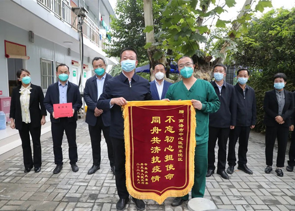 郭安貴給大家送來了錦旗和慰問金,并與醫(yī)護人員親切交談。他仔細了解了丹鳳轉(zhuǎn)入商洛市中心醫(yī)院患者的治療和生活情況,代表丹鳳縣委縣政府,對大家一個多月來堅守崗位,義無反顧投入到疫情防控最前線的辛勤付出表示衷心感謝和崇高敬意,并叮囑細心照護好住院患者,縣衛(wèi)健部門做好配合支持工作。
