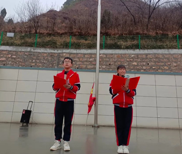 伴隨著《義勇軍進行曲》那高亢激昂的旋律,升旗儀式拉開了序幕,全體師生向國旗行注目禮,五星紅旗迎著朝陽冉冉升起。雖然天氣寒冷,但是每個學生都展現(xiàn)了積極陽光的精神面貌。
