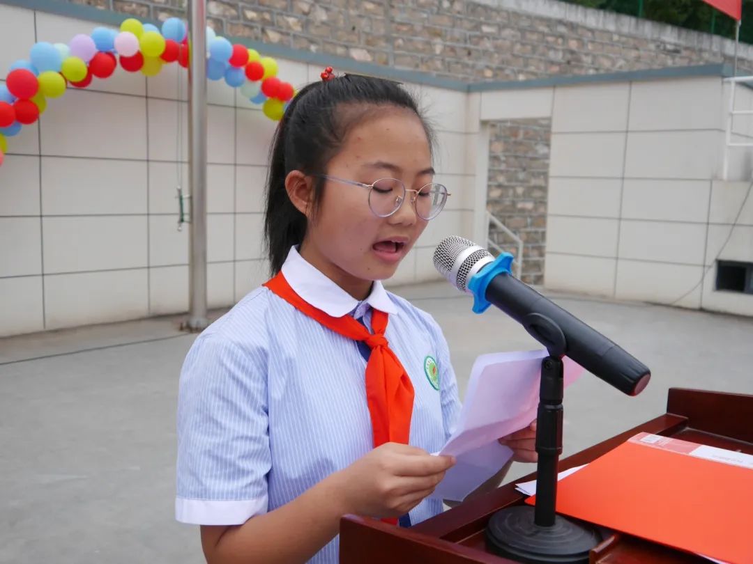 少年沒有偏旁,自己便是華章;少年本就滾燙,更應(yīng)競秀無雙。六(1)中隊(duì)余欣怡作為學(xué)生代表上臺(tái)發(fā)言,她對老師們的辛勤付出表示感謝,她號召全體學(xué)生樹立一個(gè)“我行”信心,形成一種“刻苦”學(xué)風(fēng),培養(yǎng)一個(gè)“自覺”習(xí)慣,創(chuàng)設(shè)一個(gè)“文明”環(huán)境,修身養(yǎng)德,揚(yáng)帆遠(yuǎn)航。