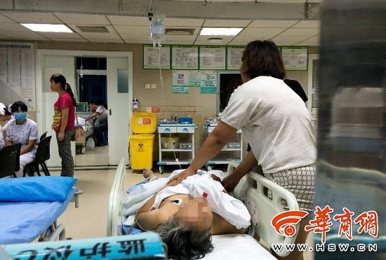 2015年8月9日晚,西安市唐都醫(yī)院,喝農(nóng)藥的王某正在接受救治。