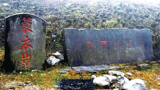 在上述“簔衣嶺”碑旁邊,另有一長約3米,高約0.6米的石碑,中間刻篆體“藍褸開疆”(“藍褸”本指破舊衣裳,“藍褸開疆”在這里意為艱苦辟路)四個大字。左右兩旁分刻隸書小字,寫的是紀念修路的內(nèi)容。