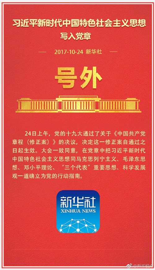 十九大新華社快訊:大會通過了關(guān)于《中國共產(chǎn)黨章程(修正案)》的決議。習(xí)近平新時代中國特色社會主義思想寫入黨章。