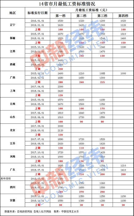 今年以來提高最低工資標準的地區(qū)至少有上海、廣東、北京、江蘇、山東、河南、新疆、四川、江西、廣西、云南、西藏、遼寧、安徽等14個省市。