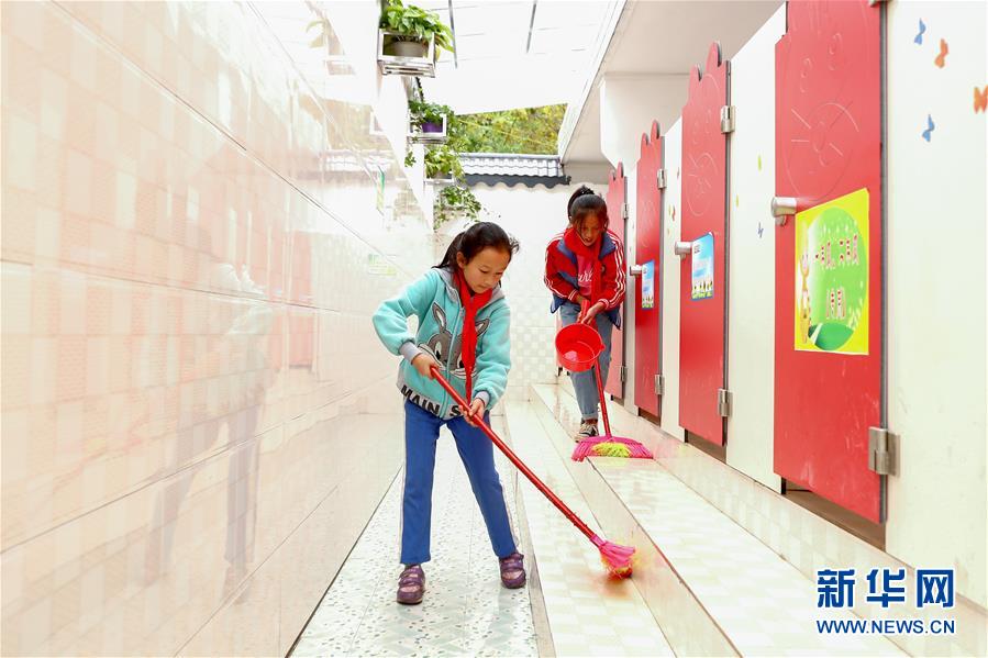 兩名學(xué)生在貴州省織金縣熊家場(chǎng)鎮(zhèn)小學(xué)的廁所打掃衛(wèi)生(2018年10月23日攝)。新華社記者 張玉薇 攝