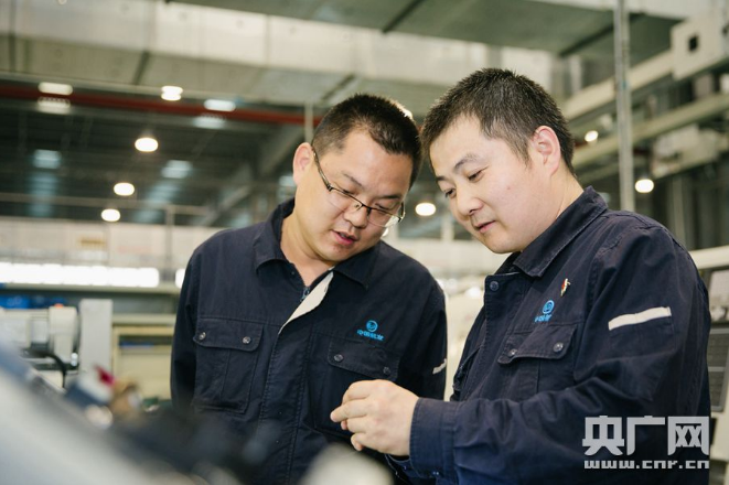 權(quán)曉寧(右)與同事討論加工技術(shù)(央廣網(wǎng)發(fā) 受訪者供圖)