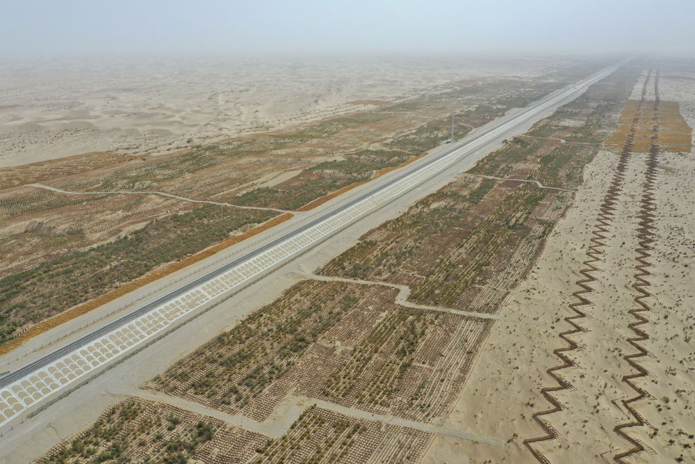 記者從中鐵第一勘察設(shè)計(jì)院集團(tuán)有限公司了解到,在被流動(dòng)沙丘侵害嚴(yán)重的和若鐵路沿線,建設(shè)者修建草方格近5000萬(wàn)平方米,種植梭梭、紅柳、沙棘等灌木和喬木近1296萬(wàn)株,林帶覆蓋面積超過(guò)11萬(wàn)畝,這條“綠色走廊”成為防風(fēng)固沙的天然屏障。