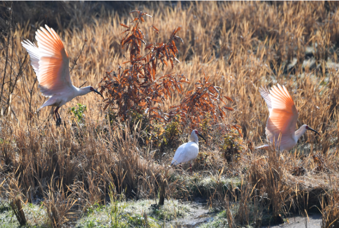 1月4日,朱鹮在草池灣“朱鹮小村”的稻田內(nèi)覓食。新華社記者邵瑞 攝