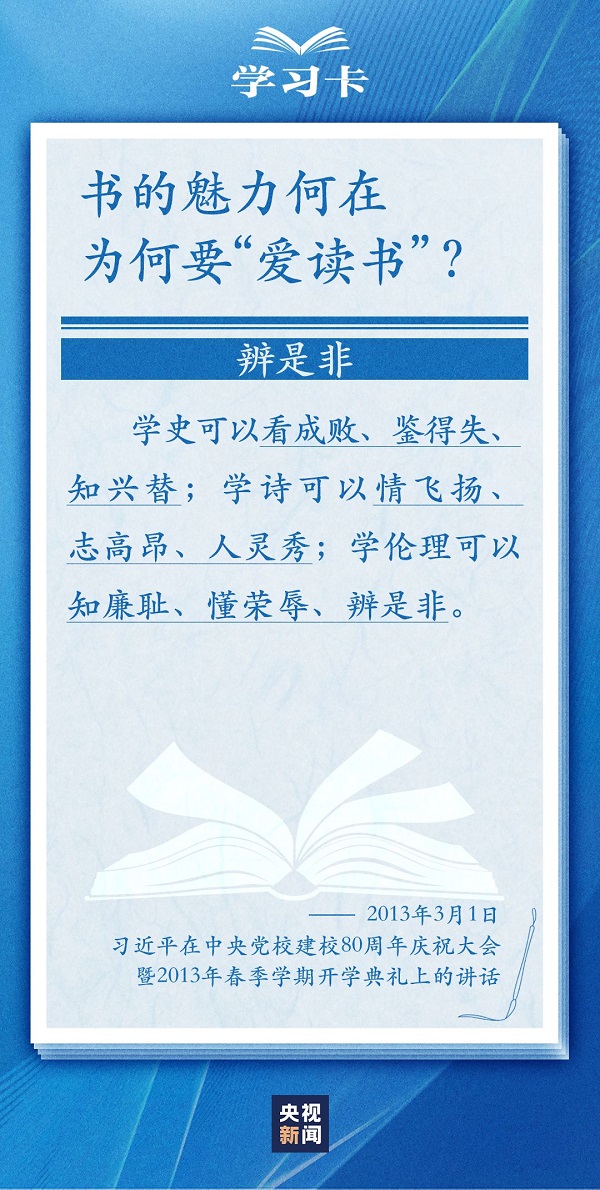 今天(4月23日)是世界讀書日。習近平曾多次講述和書籍的不解之緣,分享讀書學習的感悟,倡導(dǎo)“愛讀書、讀好書、善讀書”。書的魅力何在,為何要“愛讀書”?如何能“選好書”?怎樣“善讀書”?一起學習↓