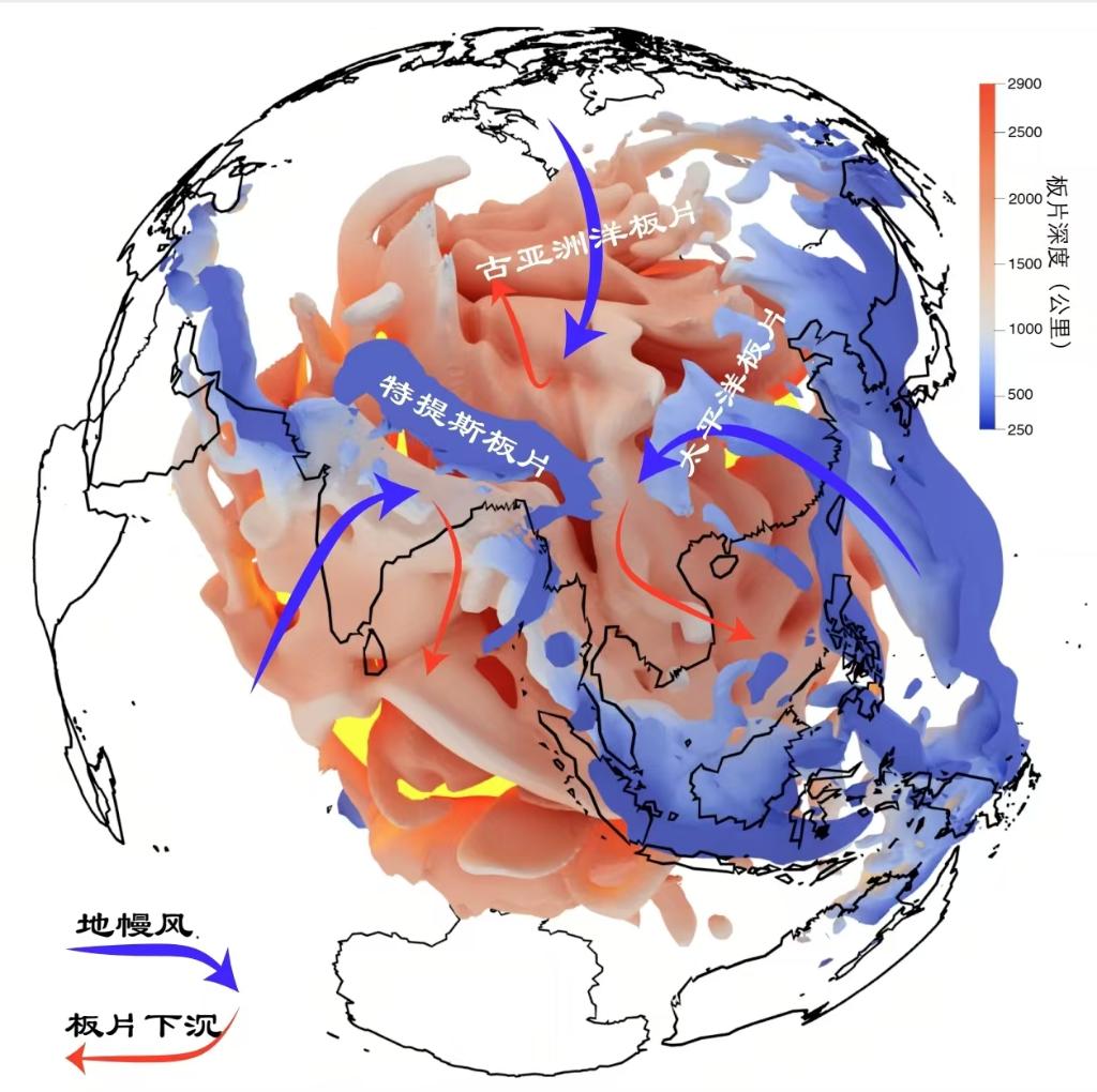 該項(xiàng)目研究團(tuán)隊(duì)進(jìn)一步分析指出,前期俯沖的新特提斯洋板片和伊邪那岐—太平洋板片在沉入下地幔的過程中,對(duì)上地幔造成巨大橫向壓強(qiáng)變化,并在青藏高原下方形成一個(gè)低壓中心,壓強(qiáng)變化驅(qū)動(dòng)著青藏高原周圍的上地幔從遠(yuǎn)到近的匯聚,進(jìn)而形成“地幔風(fēng)”。