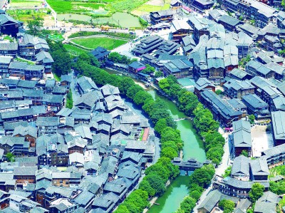 ▲貴州雷山縣西江千戶(hù)苗寨內(nèi)的河流與風(fēng)雨橋。新華社發(fā)