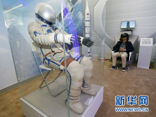 9月26日,參觀者在進(jìn)行長(zhǎng)征二號(hào)F運(yùn)載火箭發(fā)射場(chǎng)組裝VR體驗(yàn)。新華社記者沈伯韓攝