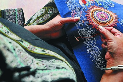 水族馬尾繡傳承人韋應(yīng)麗正在刺繡。寧堅(jiān)攝/光明圖片