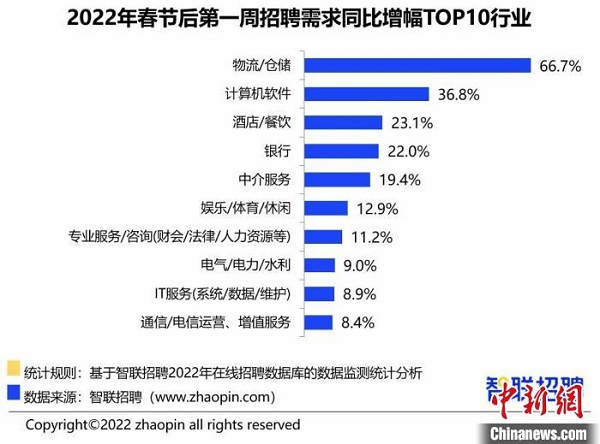 2022年春節(jié)后第一周招聘需求同比增幅前10行業(yè)。 智聯(lián)招聘供圖。