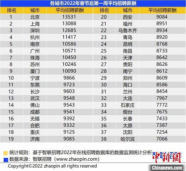 各城市2022年春節(jié)后第一周平均招聘薪酬。 智聯(lián)招聘供圖。